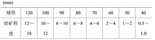 (2)用各级别粒度上限(如18、12、10、8……等)或上、下限平均值(如15、11、9、7……等)参照表 1 或利用公式确定各粒级需要加入的球的直径,如表1给矿粒度和适宜球径的关系,如