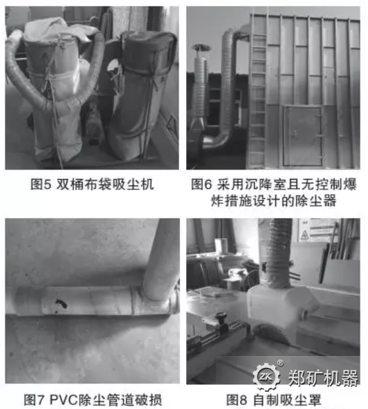 调研发现,大多数的木材加工企业采用比较简单的除尘设备设施,如双桶布袋吸尘机等,如图5。除尘效果很差,远远不能满足车间粉尘清扫需求。虽然有的企业设置了除尘系统,但除尘系统设计不规范,比如除尘器下部采用沉降室收尘,未采用任何控制爆炸的措施,如图6,除尘管道采用PVC管道,如图7,吸风罩,如图8,设计不合理导致岗位粉尘沉积严重,除尘系统采用正压吹送粉尘,且未采取可靠的防止点燃源的措施等。
